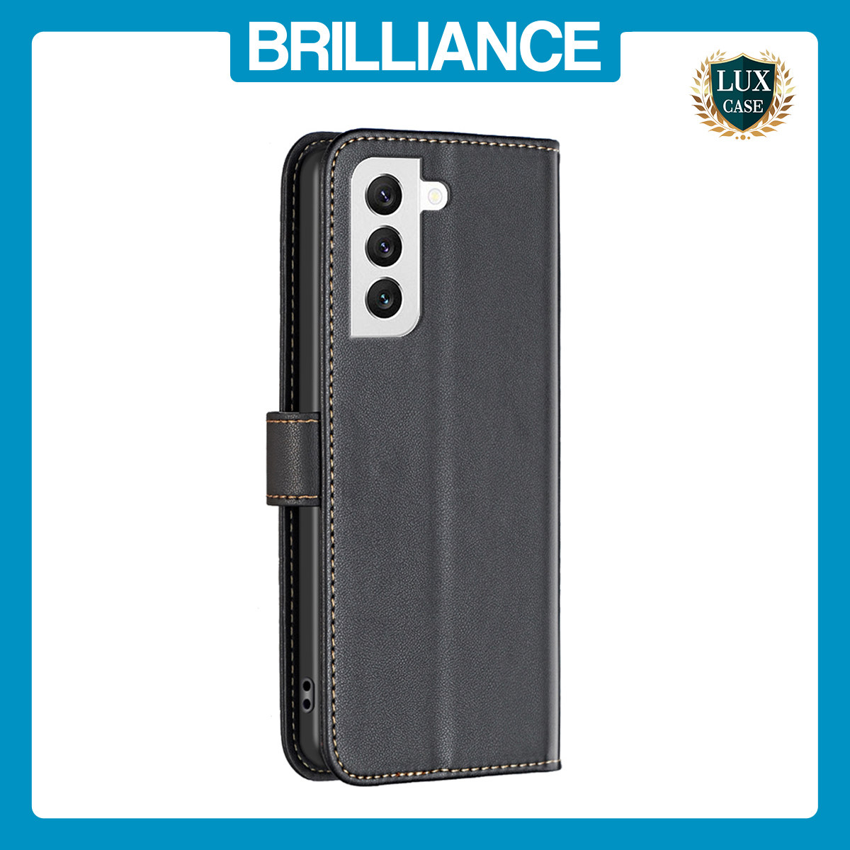 Brilliance LUX iPhone 14 Flip PU Leather Wallet ShockProof Imprinted Cowhide Texture with Wrist Strap Case Black