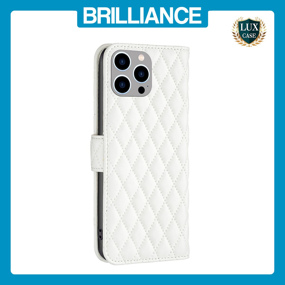 Brilliance LUX iPhone 14 Pro Max Flip Book PU real Leather Wallet Holder & Kickstand with Card Pockets Case White