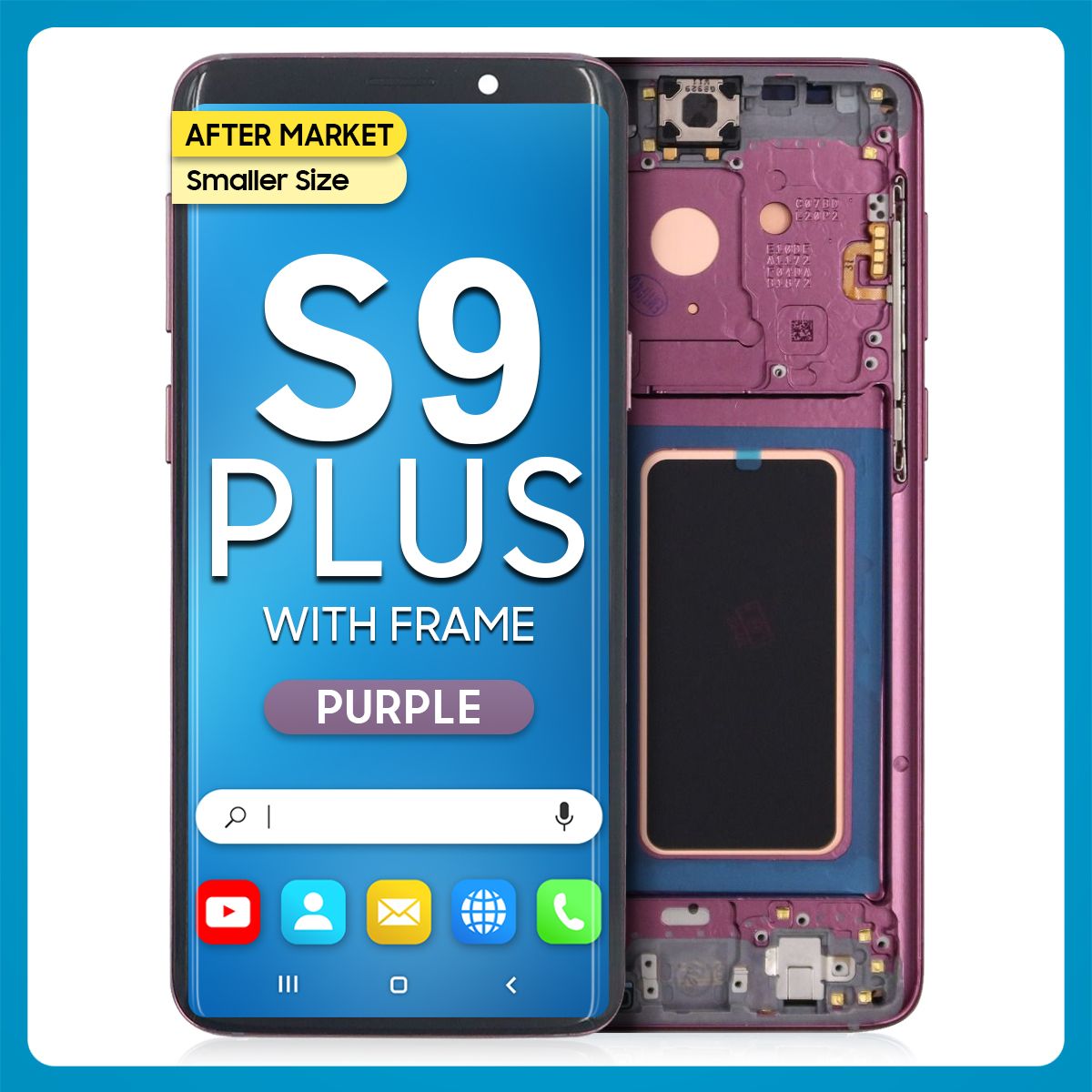 The Samsung S9 Plus LCD with Touch + Frame After Market Purple (Smaller Size) is a trademark owned by Samsung Inc., registered in the United States and other jurisdictions.